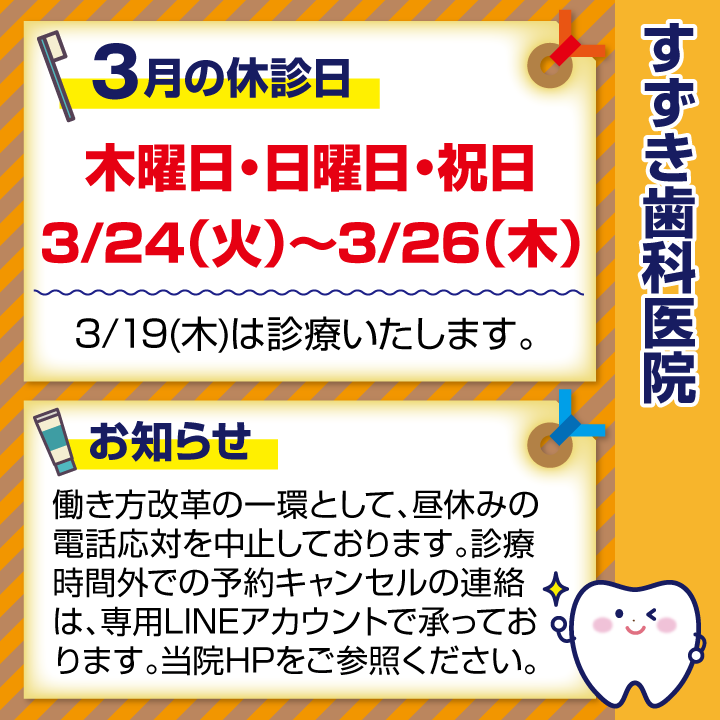 すずき歯科医院ブログ > お知らせ > 3月休診日情報